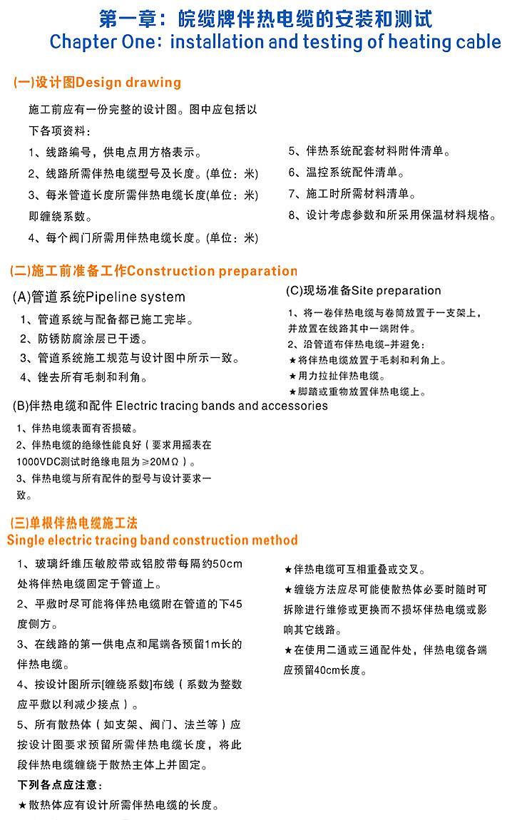 以图片形式展现电伴热带设计、施工前的准备,以及施工中的步骤,包括测试和验收事项。