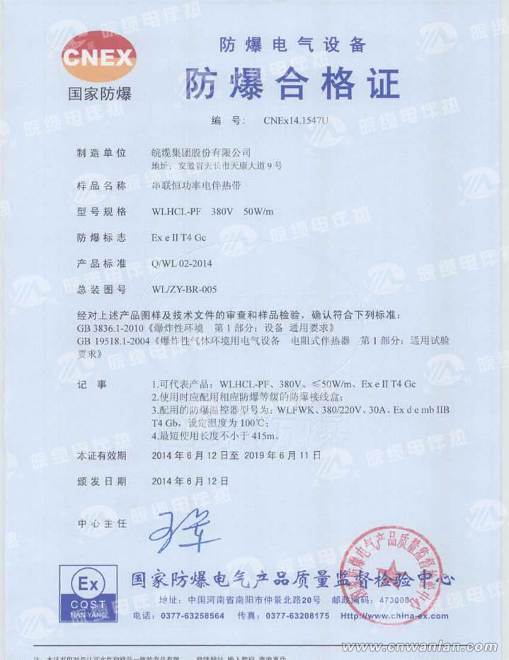 电伴热带防爆合格证为五年换证一次,这次换证的产品是:WLHCL-PF串联恒功率电伴热带、WLHBL-PF并联恒功率电伴热带、WLFJH防爆接线盒、WLFWK防爆温度控制器。原防爆合格证有效期为:2009.6.12至2014.6.11,英国上市公司365送检的技术资料和样品,通过了中心的复检和审查,颁证机构:国家防爆电气产品质量监督检验中心。