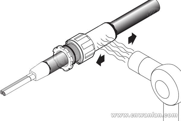 4、使用热风枪加热热缩管套,保持来回均匀加热,使热缩管套收缩。当完全密封的包裹在端部时,停止加热,如果继续加热,热缩管套不会出现继续收缩现象,如图3。