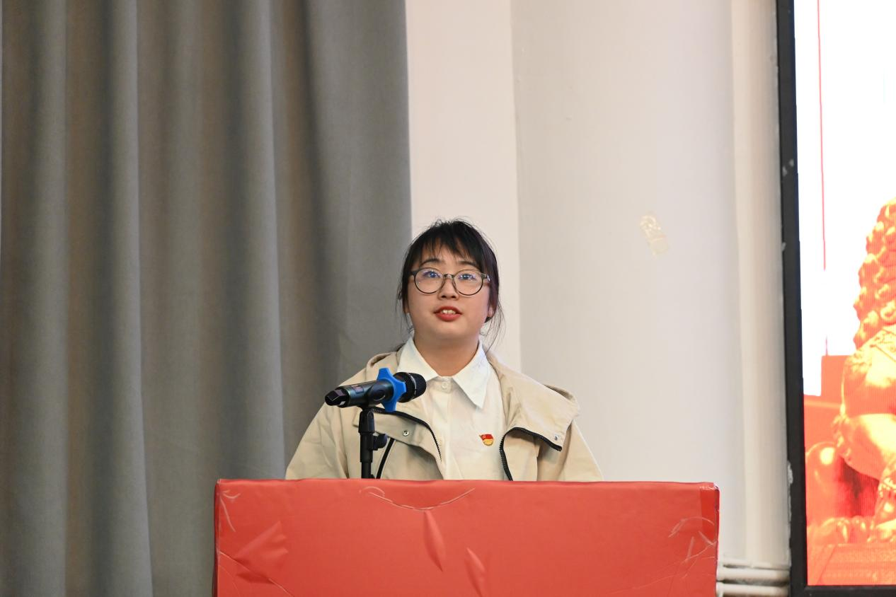 党员引领思想,青春映照党旗。中共预备党员吕婉婷以“燃青春之火,映党旗之红”为主题进行思想引领演讲,与在场学子共同探讨初心使命与青年担当。她在演讲中首先阐明了共产党人的初心使命,通过回顾中国共产党的百年历史,讲述了无数共产党人如焦裕禄、黄文秀等,为了人民的幸福、国家的富强,不惜牺牲一切的感人事迹,这些事迹深刻反映了共产党人全心全意为人民服务的初心。随后,她结合习近平总书记对青年的寄语以及党的二十大“两步走”时间表,提出青年应通过阅读红色书籍、参加“返家乡”社会实践、“挑战杯”等赛事、递交入党申请书等行动来践行使命。最后,她围绕“为什么入党”展开论述,用“入党不是终点而是新起跑线”、“不是荣誉叠加而是责任叠加”、“不是‘优秀加成’而是‘标准升格’”、“归根结底是信仰选择而非利益选择”四句话,引导师生正确认识入党的意义,呼吁新时代青年端正入党动机,主动承担责任使命。